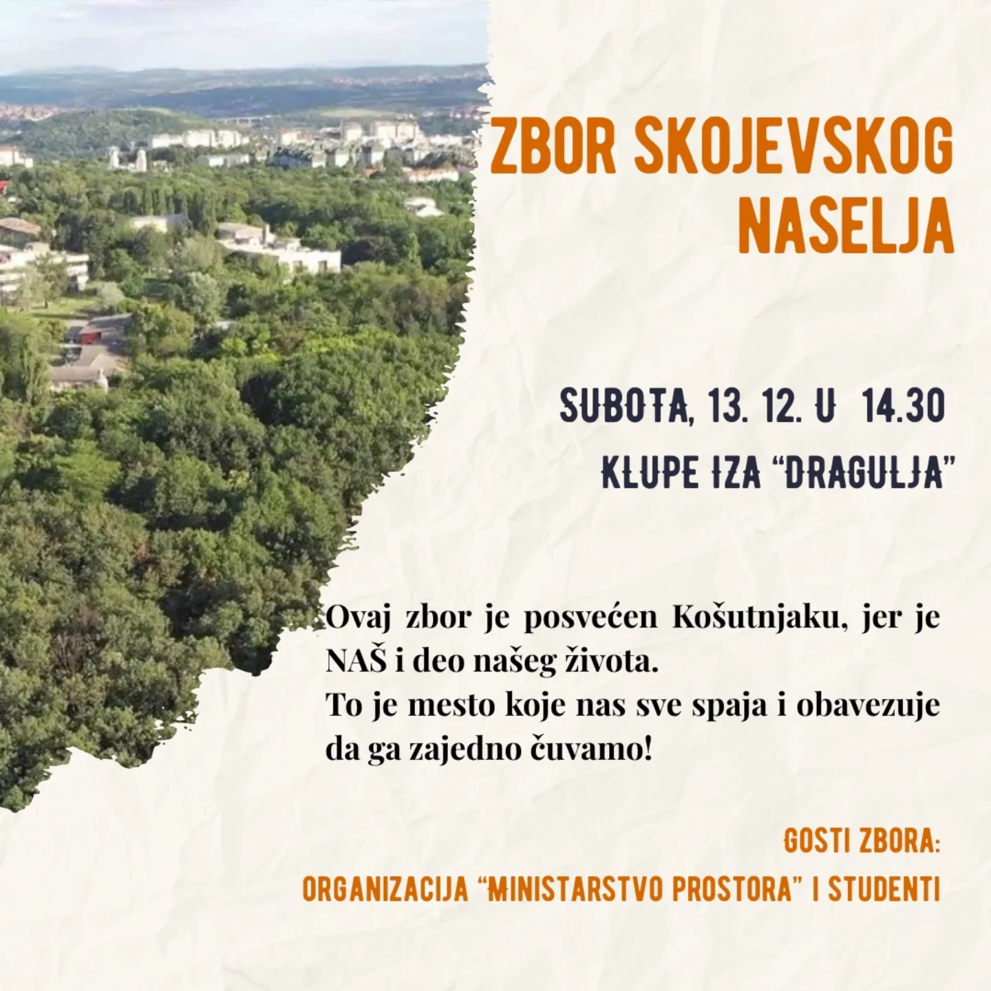 Drage komšije, pozivamo vas na zbor na kojem ćemo, između ostalog, razgovarati i o PPPPN za deo Košutnjaka, plan koji može zauvek promeniti izgled i vrednost našeg kraja. Vaše prisustvo je više od podrške – to je poruka da Košutnjak može biti odbranjen! 💚